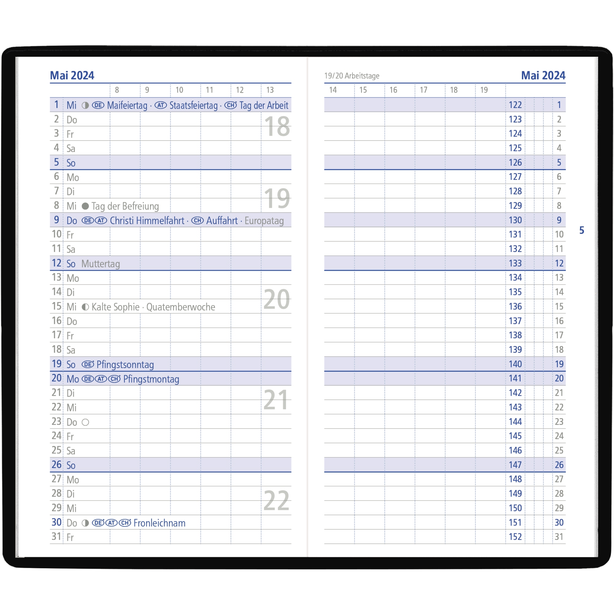 - Kalenderaufteilung: 1 Monat/2 Seiten
