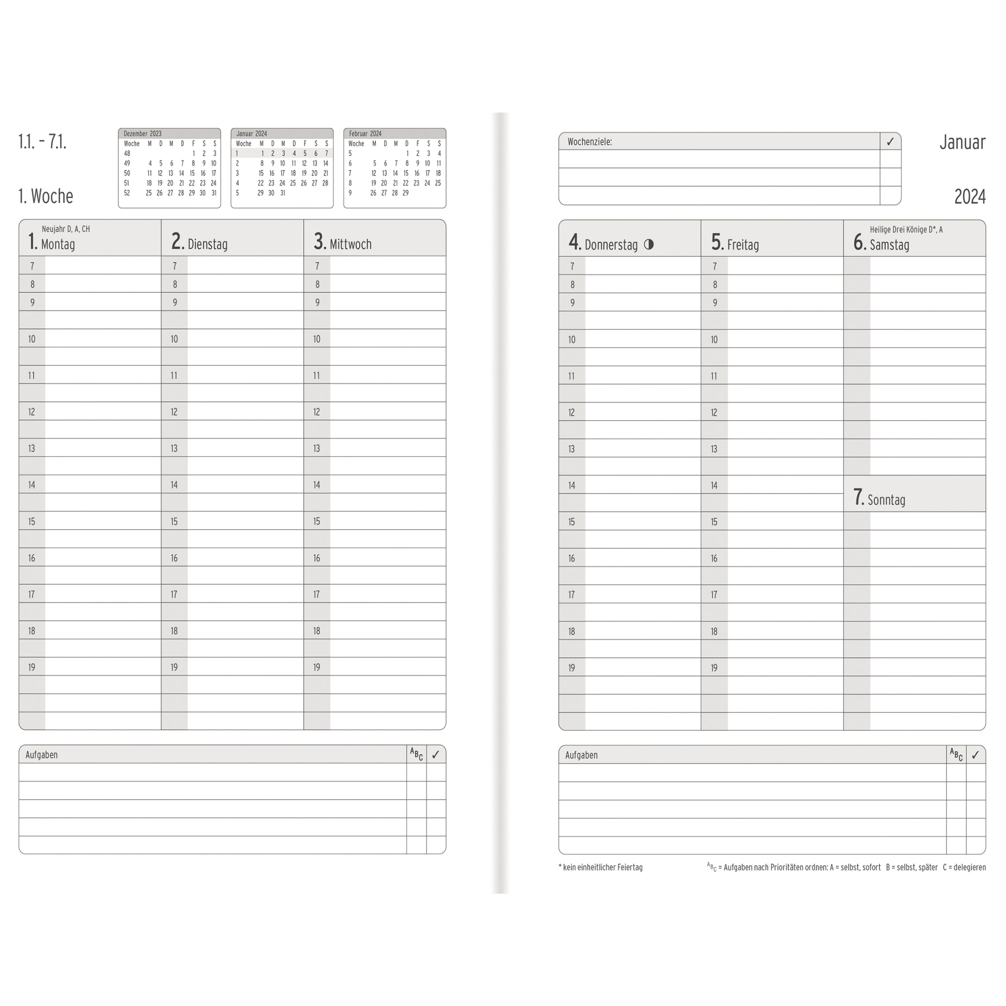 - Ausführung der Kalenderaufteilung: 1 Woche/2 Seiten