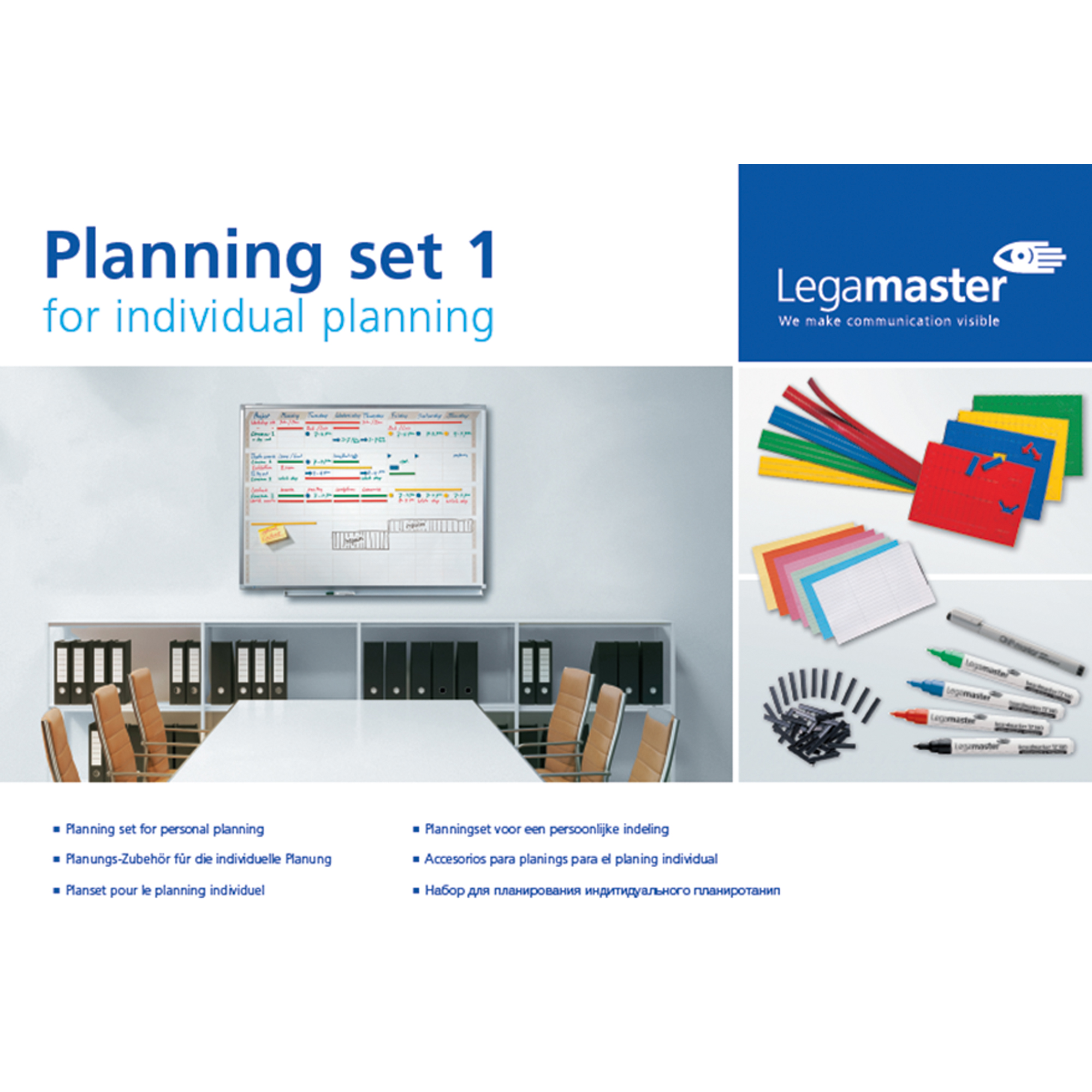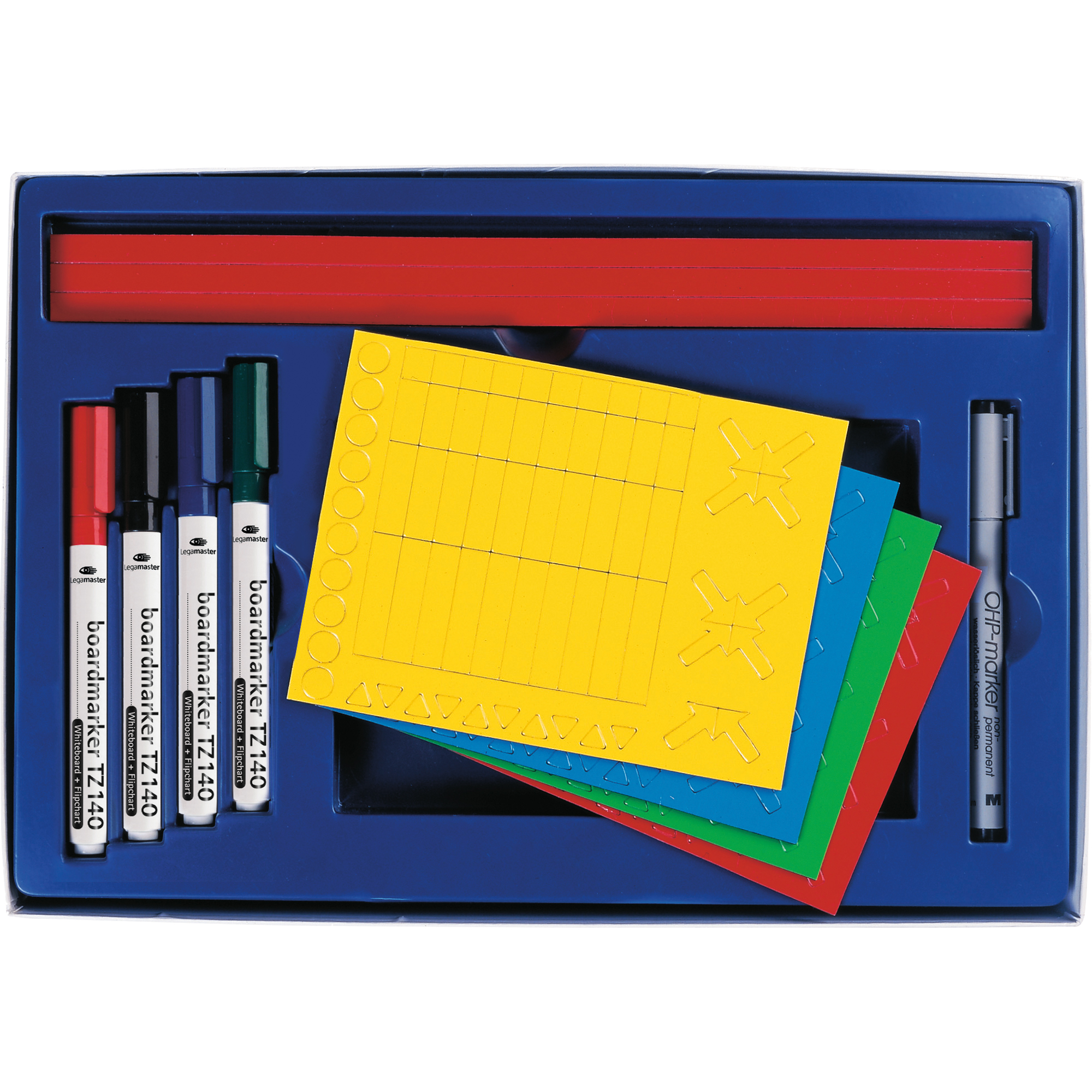 - 4 x Boardmarker TZ 140, 1 x non-permanent Marker (schwarz), 12 x Magentstreifen 10 x 300 mm (je 3 rot, blau, grün, gelb), 120 x Magnetsymbole 20 mm (je 30 in rot, blau, grün, gelb)