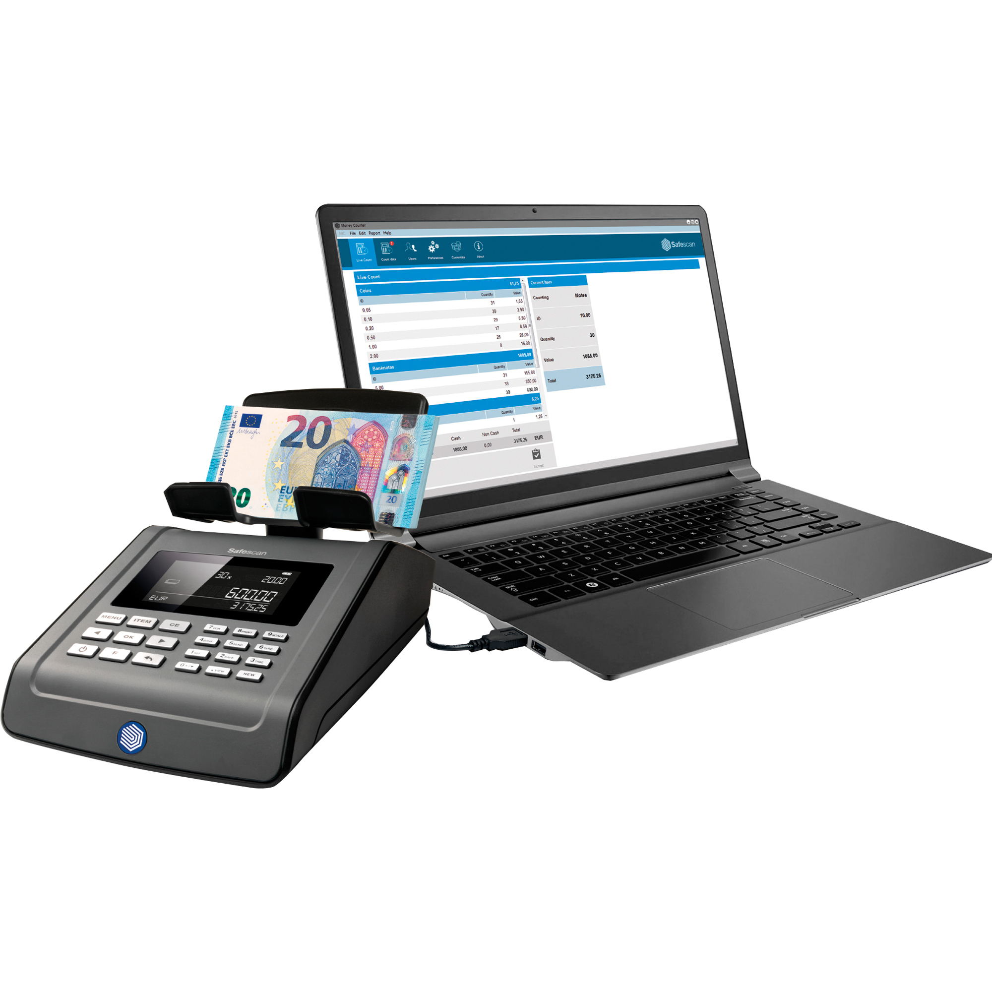 - inkl. Kurzanleitung, Geld-Plattform, Münzschale, EU-, UK-Netzstecker, USB-Anschlusskabel, USB-Druckerkabel